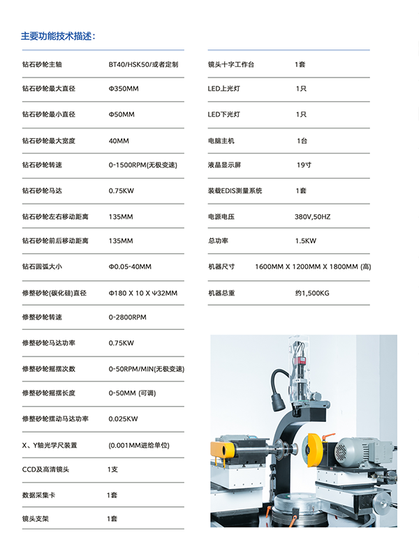 機(jī)床主軸砂輪作為被修整的金剛石砂輪或CBN砂輪,附件上所安裝的砂輪作為修整砂輪即綠色碳化硅砂輪;被修整砂輪二個方向可以調(diào)整,即X軸、Y軸;修整砂輪有三個方向可以調(diào)整,即旋轉(zhuǎn)A軸、X1軸和Y1軸,并且可以變頻調(diào)速的往復(fù)擺動,除此之外,X1軸和Y1軸之間可以旋轉(zhuǎn)和定位,可以實(shí)現(xiàn)修整砂輪做180°旋轉(zhuǎn);機(jī)床配有CCD光學(xué)測量系統(tǒng)、光柵尺數(shù)顯測量系統(tǒng)、10到100倍之放大系統(tǒng)、液晶顯示器。