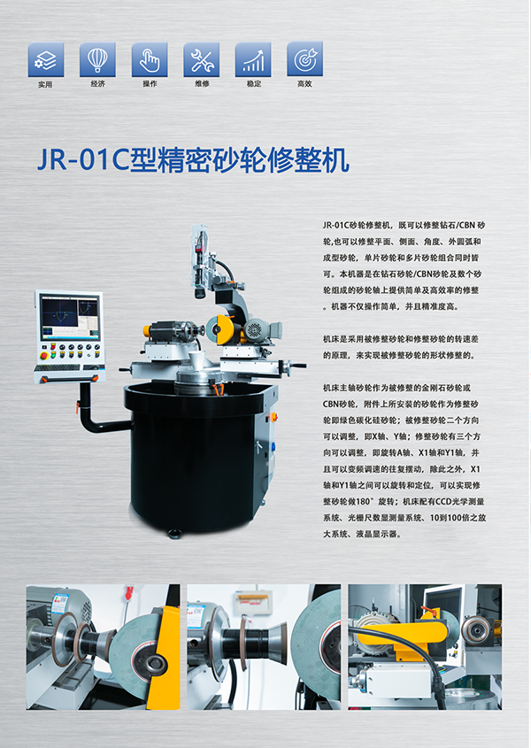 JR-01C砂輪修整機(jī),既可以修整鉆石/CBN 砂輪,也可以修整平面、側(cè)面、角度、外圓弧和成型砂輪,單片砂輪和多片砂輪組合同時皆可。本機(jī)器是在鉆石砂輪/CBN砂輪及數(shù)個砂輪組成的砂輪軸上提供簡單及高效率的修整。機(jī)器不僅操作簡單,并且精準(zhǔn)度高。